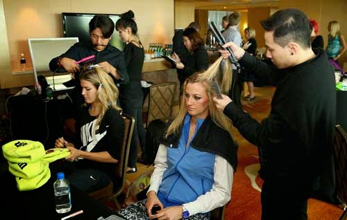 | Bouchard (trái) và Kvitova (phải) được trang điểm kĩ càng trước khi xuất hiện |