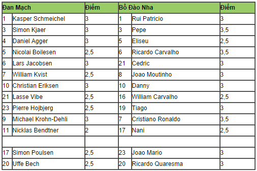 Bồ Đào Nha: 1 Rui Patricio 3 Pepe 5 Eliseu 6 Ricardo Carvalho 21 Cedric 8 Joao Moutinho 10 Danny 16 William Carvalho 19 Tiago 7 Cristiano Ronaldo 17 Nani