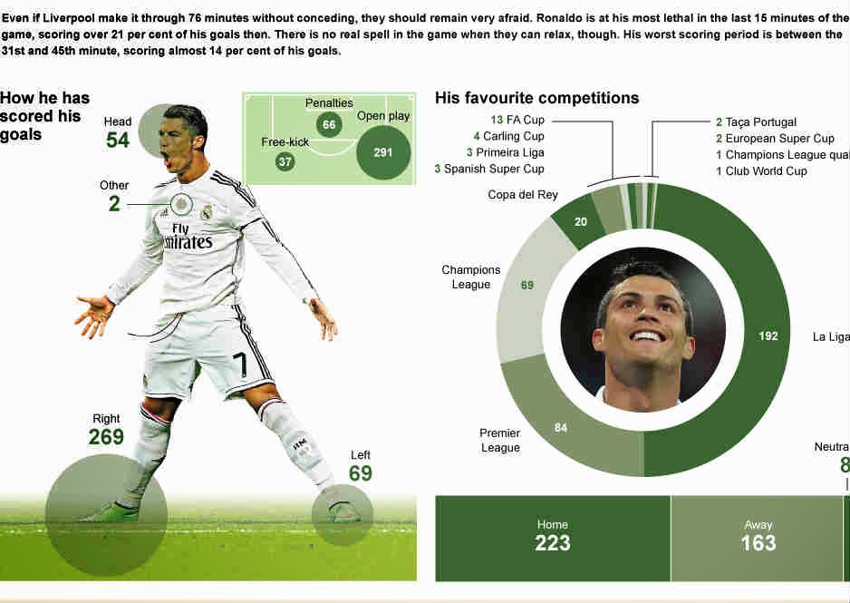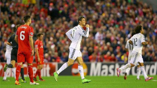 Tại Champions League mùa này, siêu sao người Bồ Đào Nha cũng đã có 3 bàn thắng trong 3 lần gặp các đối thủ của Real ở bảng B. Tại trận đấu mới đây nhất gặp Liverpool, anh cũng lập 1 siêu phẩm với pha ra sân rất nhanh và chính xác từ đường chuyền bóng đầy tinh tế của James Rodriguez.
